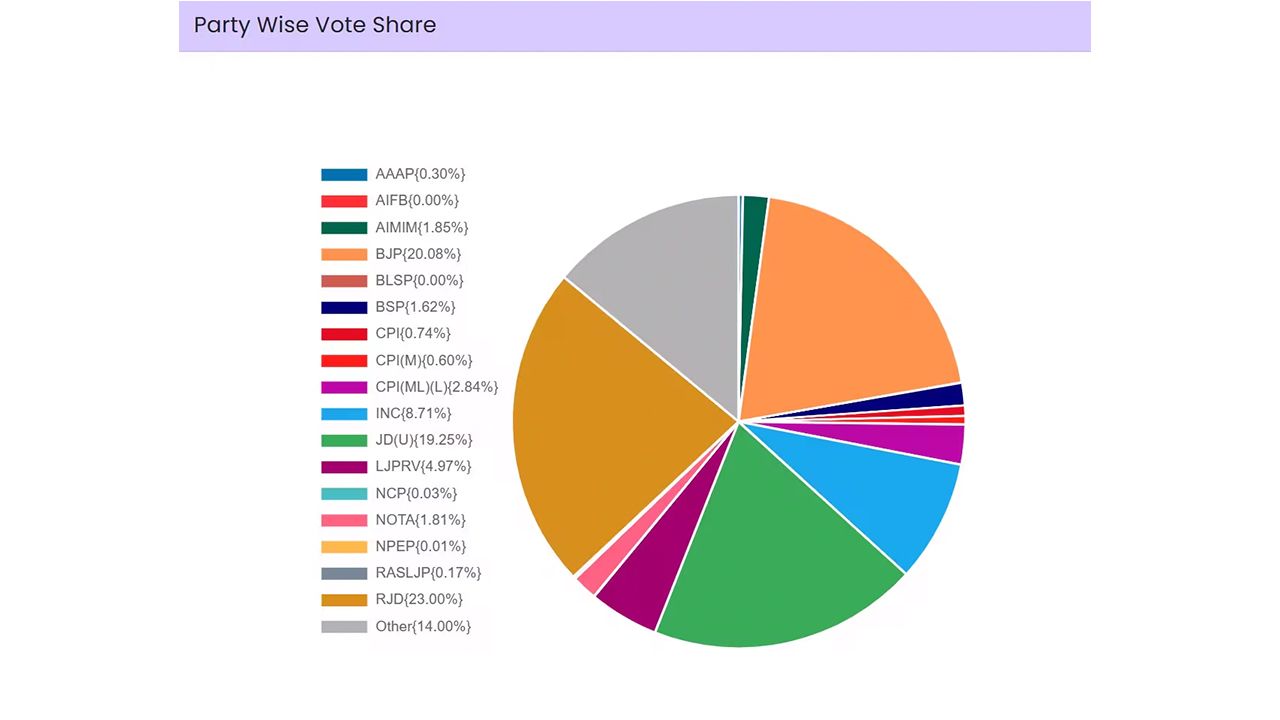 ബിഹാർ തെരഞ്ഞെടുപ്പിൽ അധികാരം ലഭിച്ച ജെ.ഡി.യു. (19.25%) വിനെക്കാളും ബി.ജെ.പി. (20.08%) യെക്കാളും ഏറ്റവുമധികം വോട്ട് വിഹിതം ലഭിച്ചത് ആർ.ജെ.ഡി. (23%) ക്കാണ്.