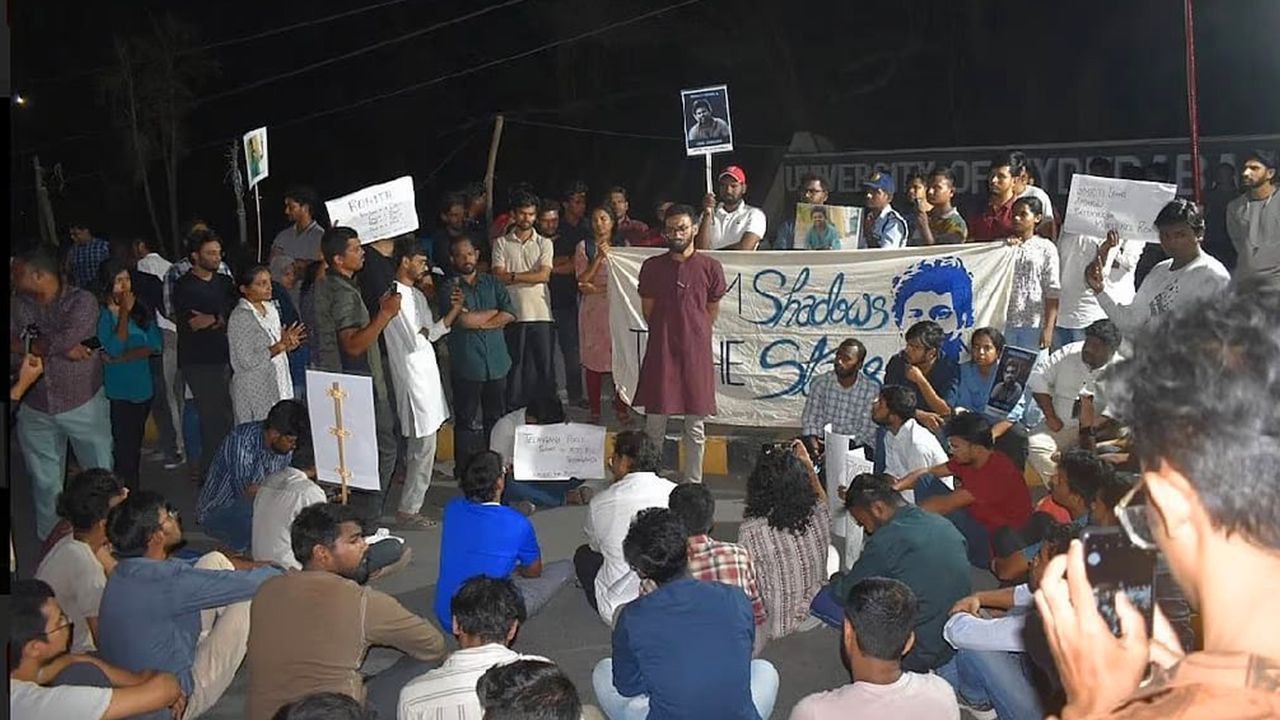 രോഹിത് വെമുലയുടെ മരണവുമായി ബന്ധപ്പെട്ട കേസിൽ തെലങ്കാന പോലീസിന്റെ റിപ്പോർട്ടിൽ പ്രതിഷേധിച്ച് ഹൈദരാബാദ് സെൻട്രൽ യൂണിവേഴ്സിറ്റി സ്റ്റുഡന്റ് യൂണിയൻ (HCUSU) 2024 മെയ് 3 ന് ഹൈദരാബാദിൽ പ്രതിഷേധിക്കുന്നു.